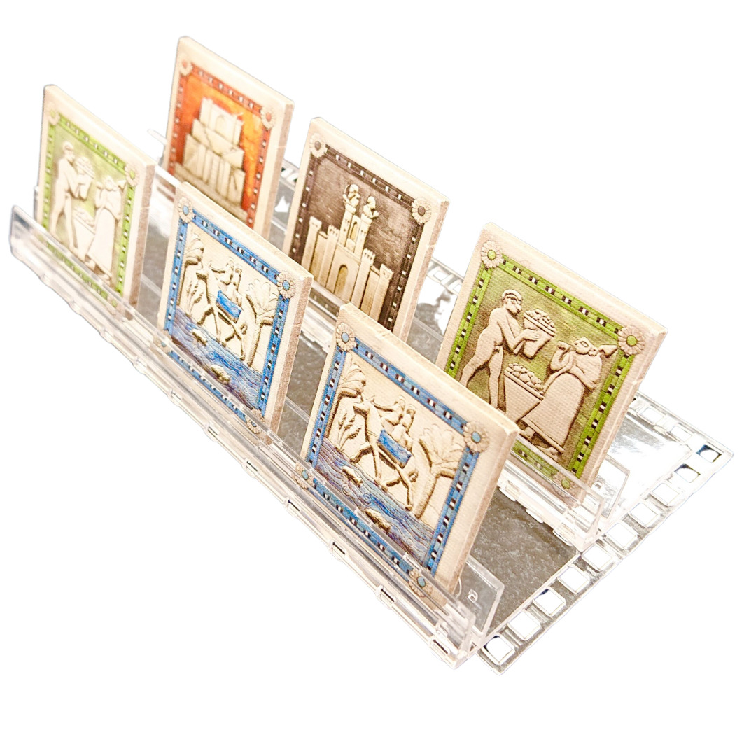 サイコロコメント最安!これがなによりも大きい。あとはとにかくシンプル。機能はいらない方はこれが吉。横から見えない点では差別化できていて〇。その代わり、持ち運び時にはかさばるデメリットもありそう。アクリルだと下のほうが見えるし、連結可能でこの値段は安い!タイルも置けるし、場に出ているボーナスカードにも使える。アクリルだと下のほうが見えるから重宝する。4本入りなので、仲間で集まるときには〇。ウォールナットで渋みがあって高級感あり。初デートにはこれを持参しよう。こちらは再販待ち。機能最多の一品